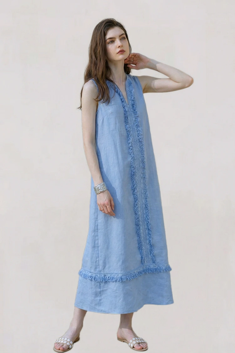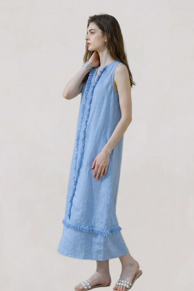 لتلبية المتطلبات الأساسية لمشتريات الجملة الصيفية، يعتمد فستان الكتان الطويل الأنيق للنساء على تصميم فضفاض، يوازن بين الراحة والشمولية. يمكن أن يناسب مختلف أنواع الأجسام، سواء كانت نحيفة أو ممتلئة قليلاً، ويمكن للجميع ارتداؤها بسهولة. يؤدي هذا إلى توسيع نطاق الجمهور المستهدف للمبيعات بشكل كبير وزيادة عائد الاستثمار للمشتريات. تصميم الرقبة على شكل حرف V بدون أكمام منعش وأنيق، ومناسب لطقس الصيف الحار. وفي الوقت نفسه، يمكن للرقبة على شكل حرف V تعديل خطوط الكتف والرقبة بمهارة، مما يؤدي إلى إطالة نسبة الرقبة وإبراز السحر الأنثوي للمرأة. يتميز تصميم الفستان الطويل بتأثير ثني جيد، حيث يسقط بشكل طبيعي من الكتفين، ويغطي بشكل فعال الدهون الزائدة على الخصر والوركين والساقين، مما يقلل من عيوب الشكل. عند المشي، يتمتع بإحساس رشيق وأنيق، مع جو قوي. هذا الفستان الطويل مناسب لسيناريوهات الصيف المختلفة. يمكن ارتداؤه بمفرده لخلق طراز فرنسي كاجوال، مناسب للمشي في المدينة، أو مواعيد عطلة نهاية الأسبوع، أو كملابس لقضاء العطلات على الشاطئ، ومناسب للأجواء الترفيهية على شاطئ البحر، وقابل للتكيف مع سيناريوهات مختلفة.