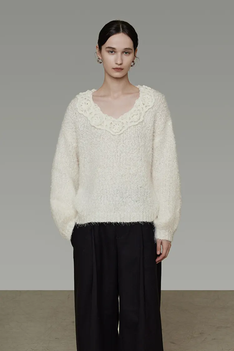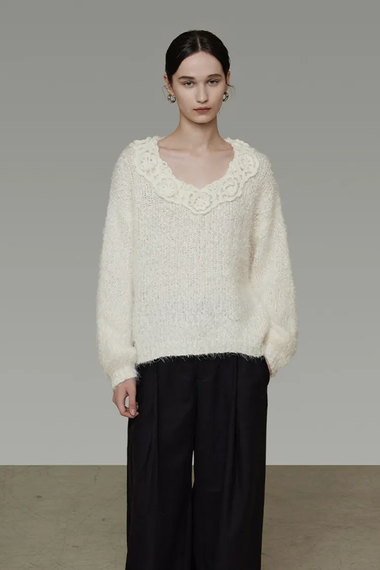 رقبة على شكل حرف V رائعة مع زخرفة دانتيل ثلاثية الأبعاد