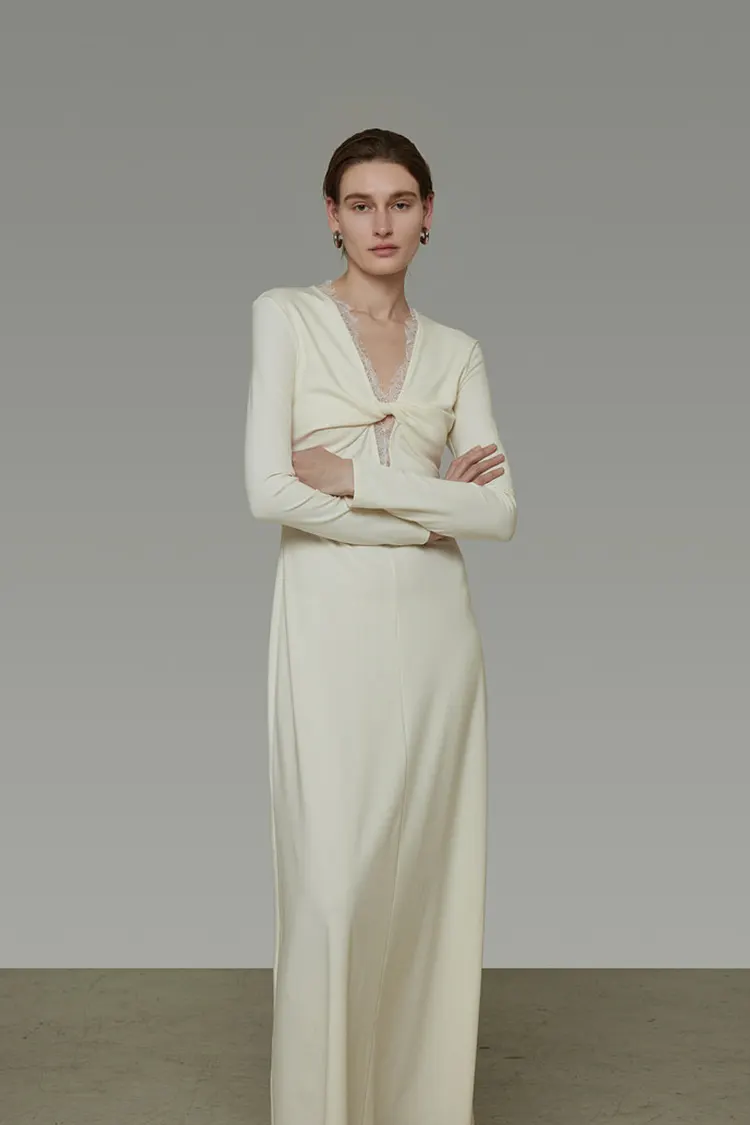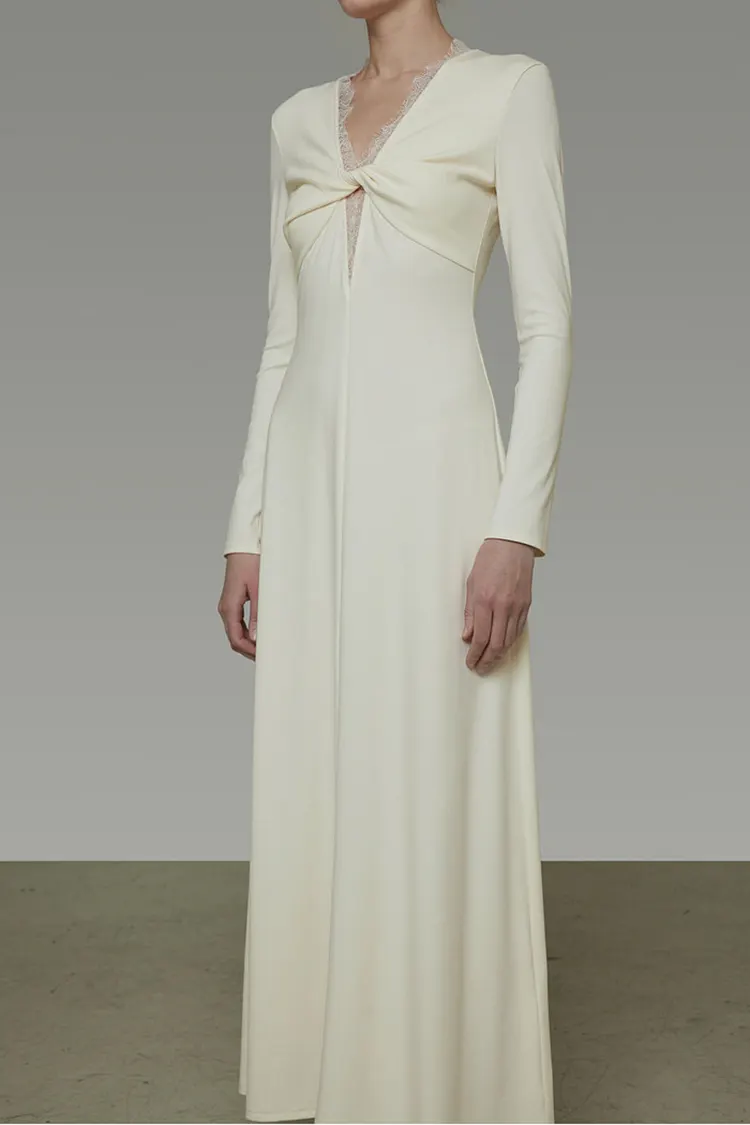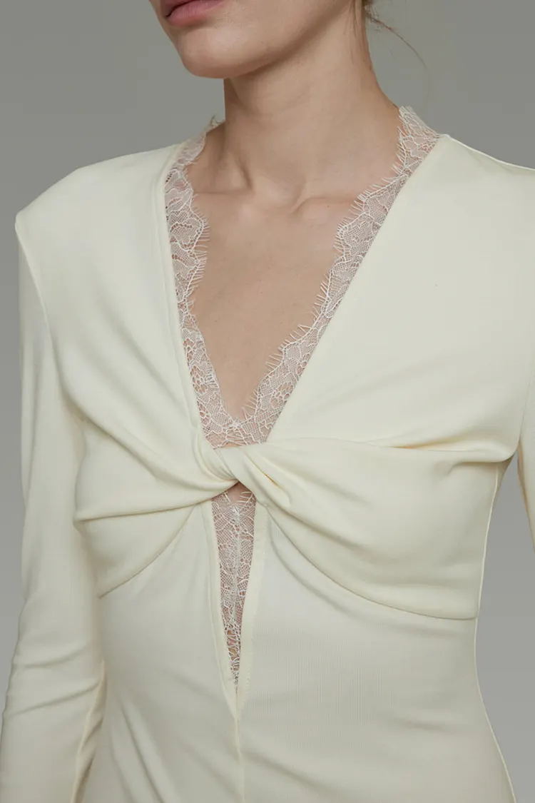 تم تثبيت الدانتيل على طول الرقبة على شكل حرف V يدويًا بدقة باستخدام خياطة قفل أنيقة، مما يندمج بسلاسة مع صورة الفستان.